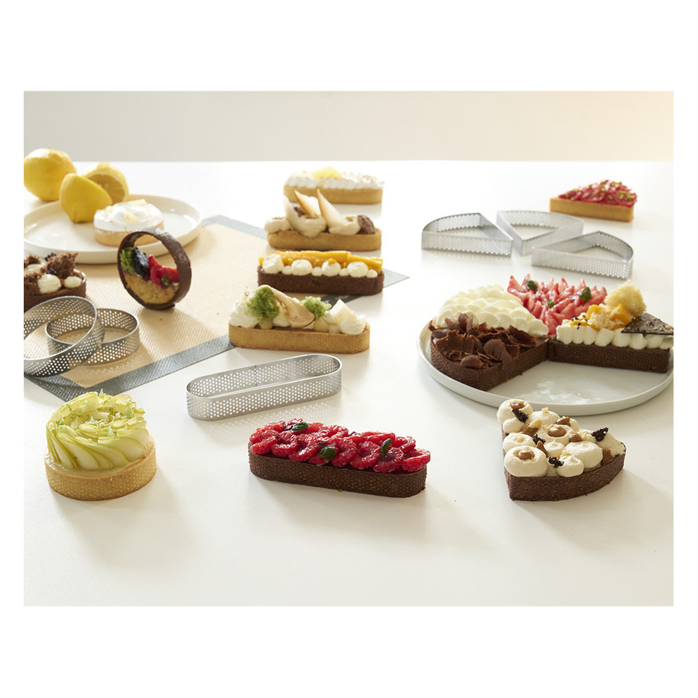 Pour obtenir un rendu optimal de vos pâtisseries, nous vous conseillons d'utiliser ces cercles à pétales micro-perforés avec le tapis de cuisson PRADEL (référence 012522) garantissant une cuisson homogène et parfaite du dessous et du tour de vos gâteaux.