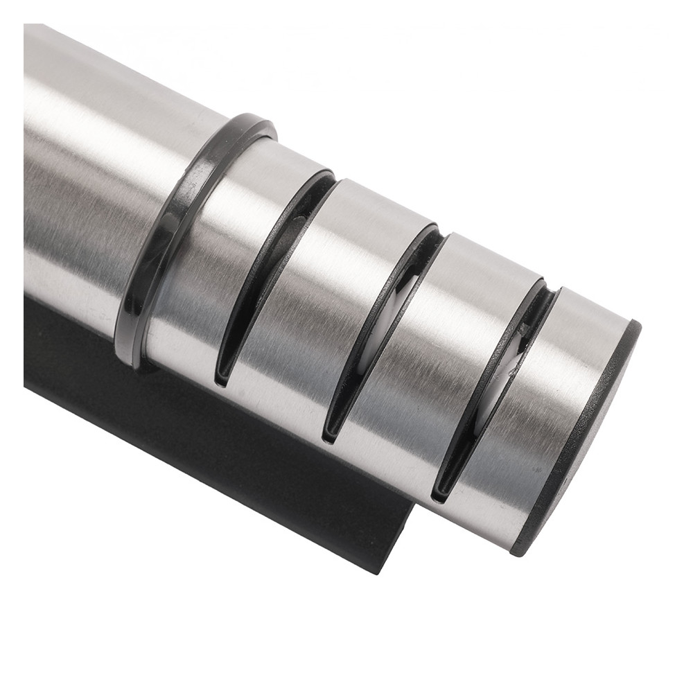 Aiguisage en 3 étapes : 2 fentes en carbure de tungstène pour aiguiser avec soins et rapidité, 1 fente en céramique pour apporter une finition parfaite.