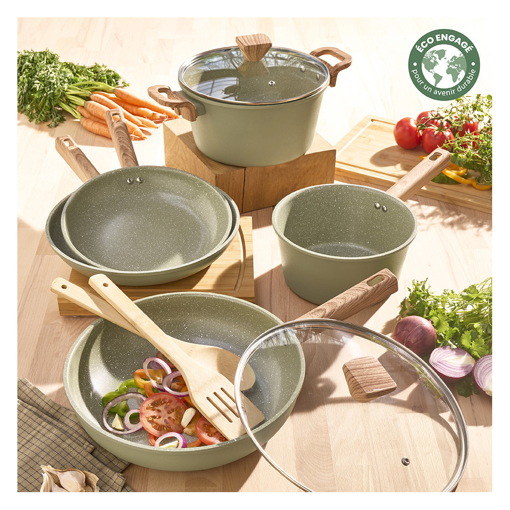 Découvrez notre nouvelle batterie 7 pièces « Oliwood », un ensemble complet qui allie praticité, design et respect de l’environnement. Elle est composée de : 2 poêles (ø24 et 28 cm), 1 casserole ø20 cm, 1 faitout avec couvercle ø 24 cm, 1 sauteuse avec couvercle ø 28 cm.