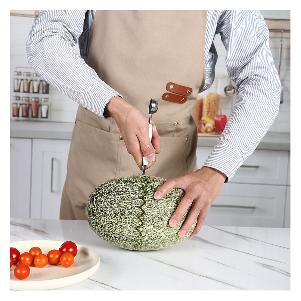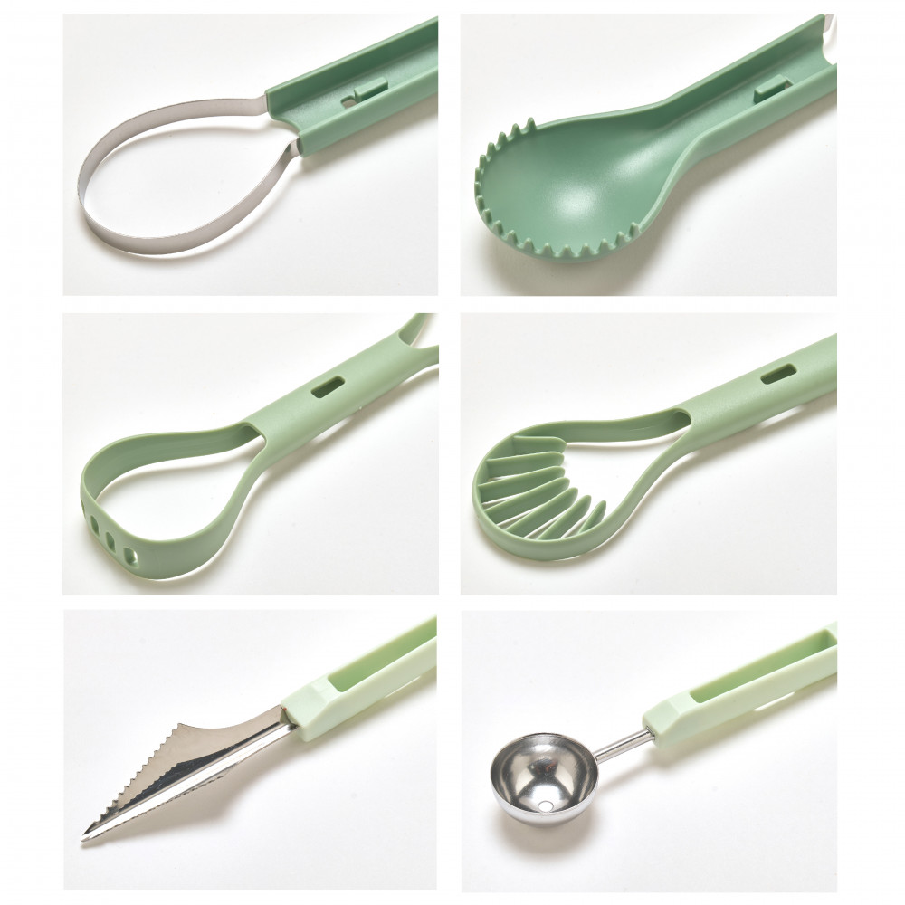 Astucieux, il combine à lui seul 6 fonctions : : Il taille vos fruits pour une présentation soignée et originale. Il retire facilement la chair, les pépins, tranche vos avocats en un seul mouvement, réalise des billes de fruits pour des desserts créatifs et élégants, écrase vos avocats sans effort pour réaliser votre guacamole…