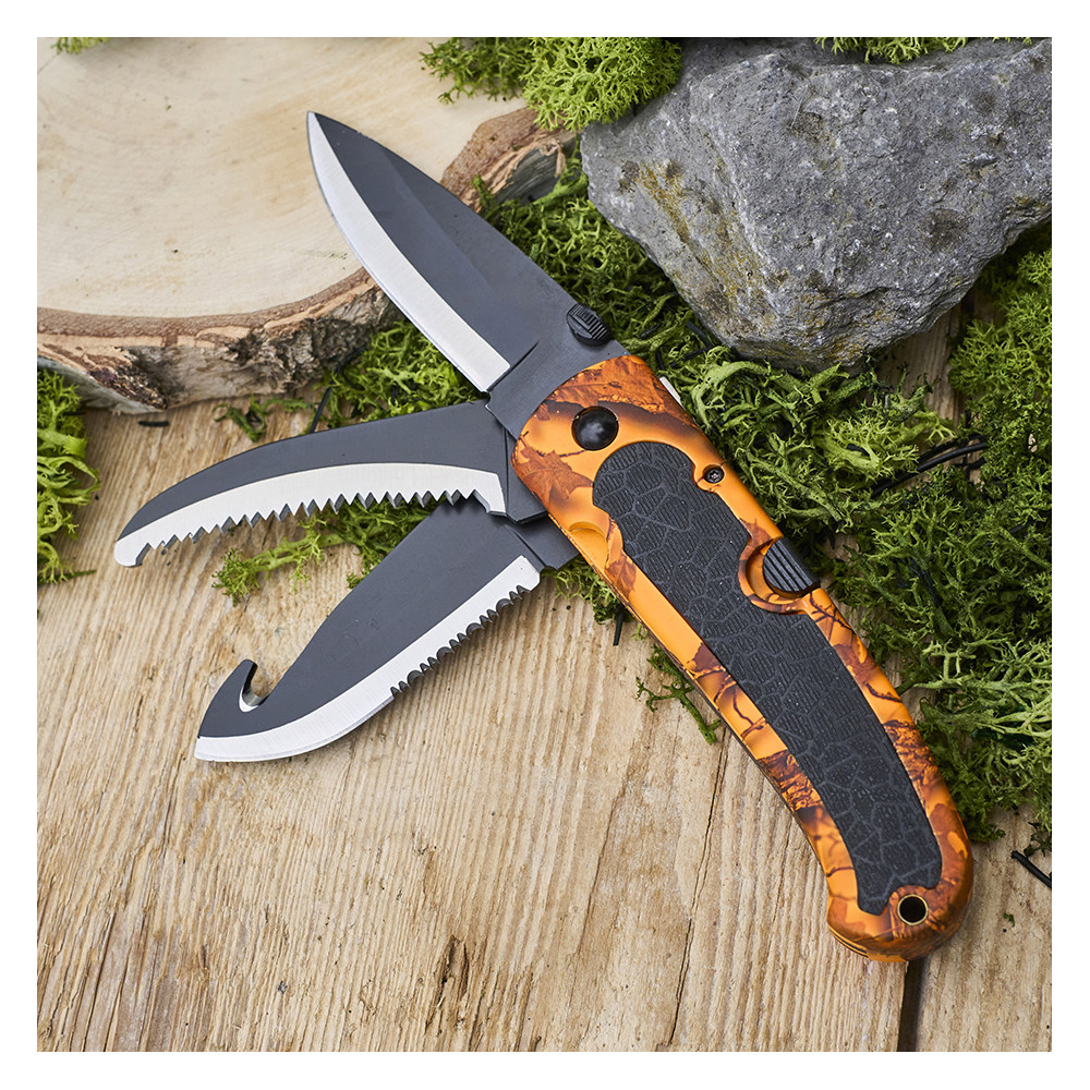 - Couteau pliant 3 lames : classique, crantée, à dépecer.