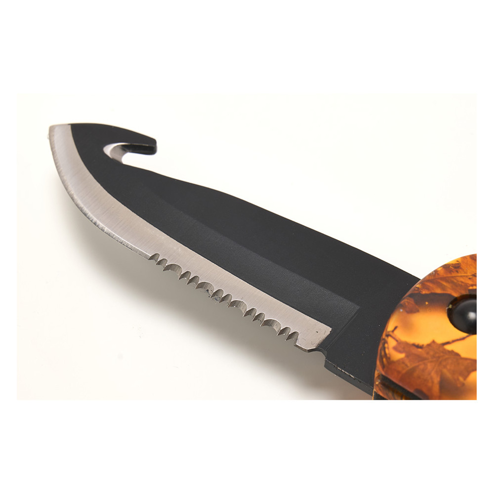 Doté de 3 lames en acier inoxydable revêtues d’un revêtement noir de très bonne qualité, ce couteau vous assure un tranchant inégalable. Il possède une lame classique, une lame crantée et une lame à dépecer.