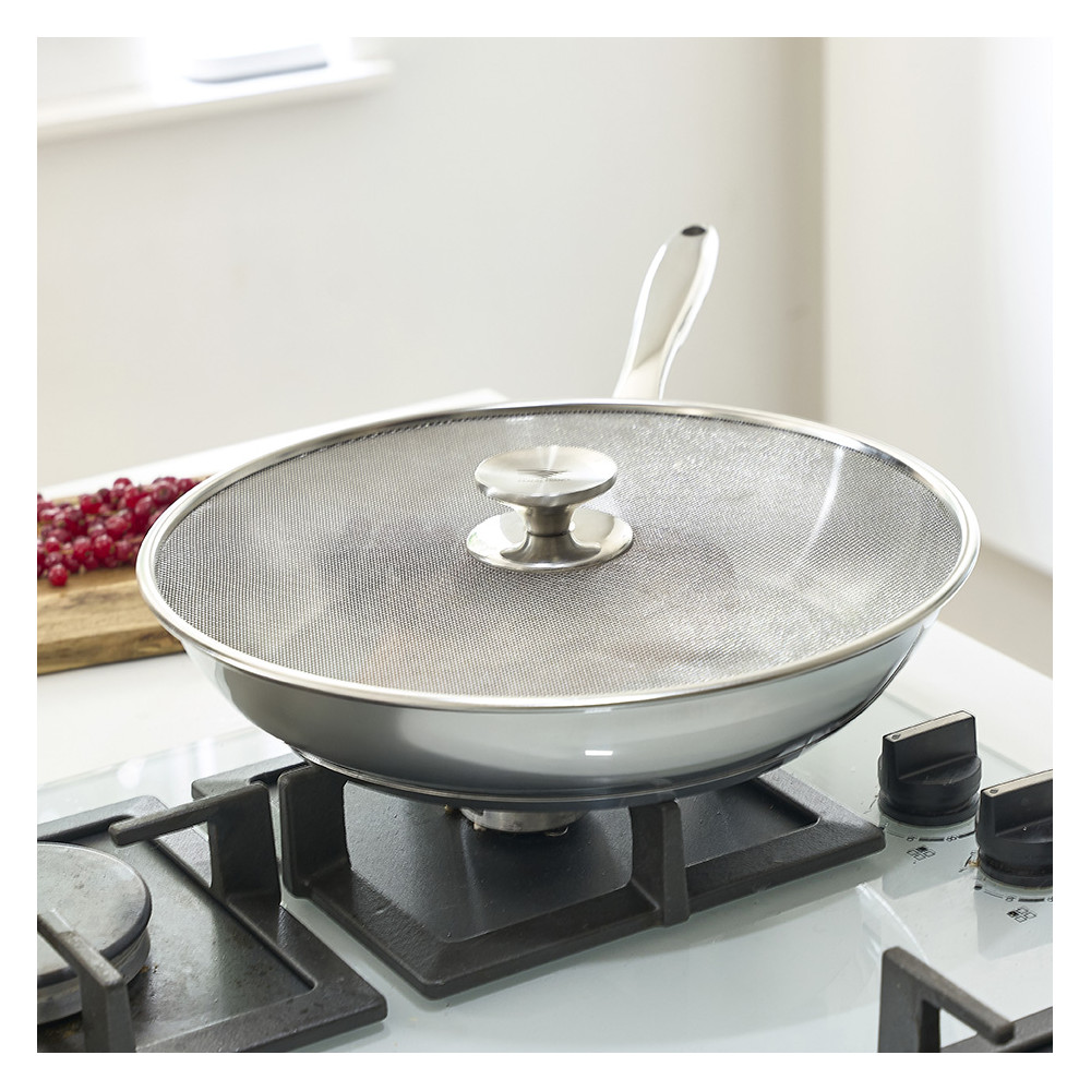 Sa maille fine en inox, résistante à la chaleur, constitue une véritable barrière contre les projections tout en laissant la vapeur s’échapper. Un moyen simple d’éviter les brûlures et les salissures sans compromettre la cuisson.