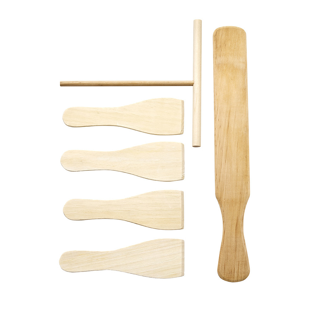 Avec cette crêpière, 6 ustensiles vous sont offert : 4 petites spatules en bois pour retourner vos petites crêpes, 1 grande spatule en bois pour retourner vos grandes crêpes et 1 râteau en bois pour étaler de façon optimale la pâte sur la plaque.