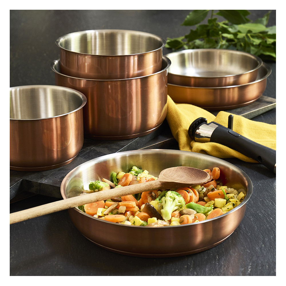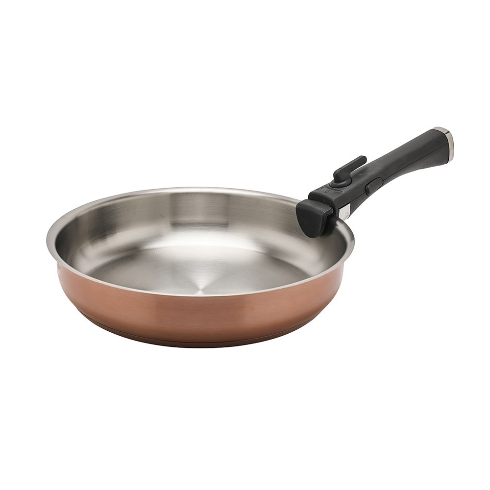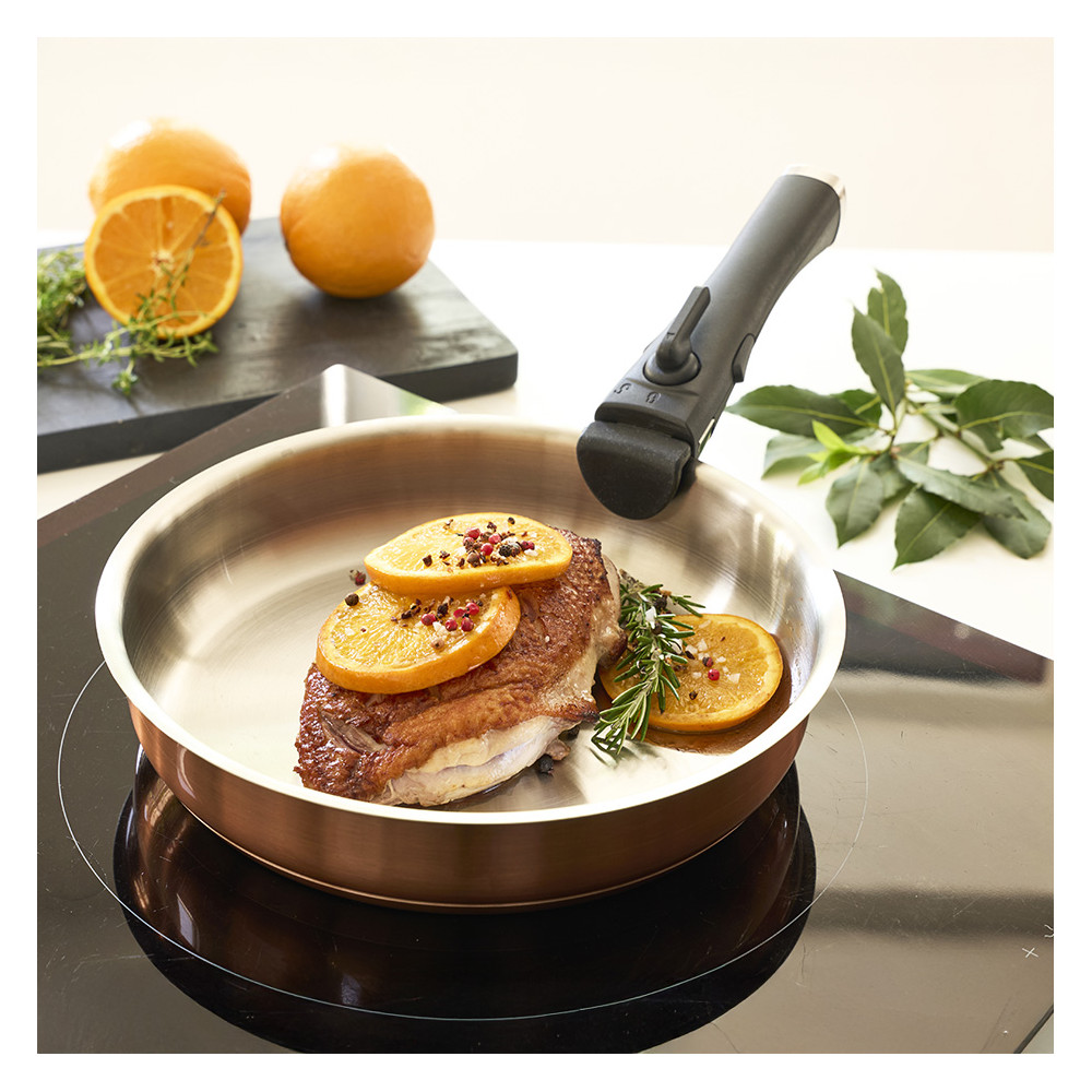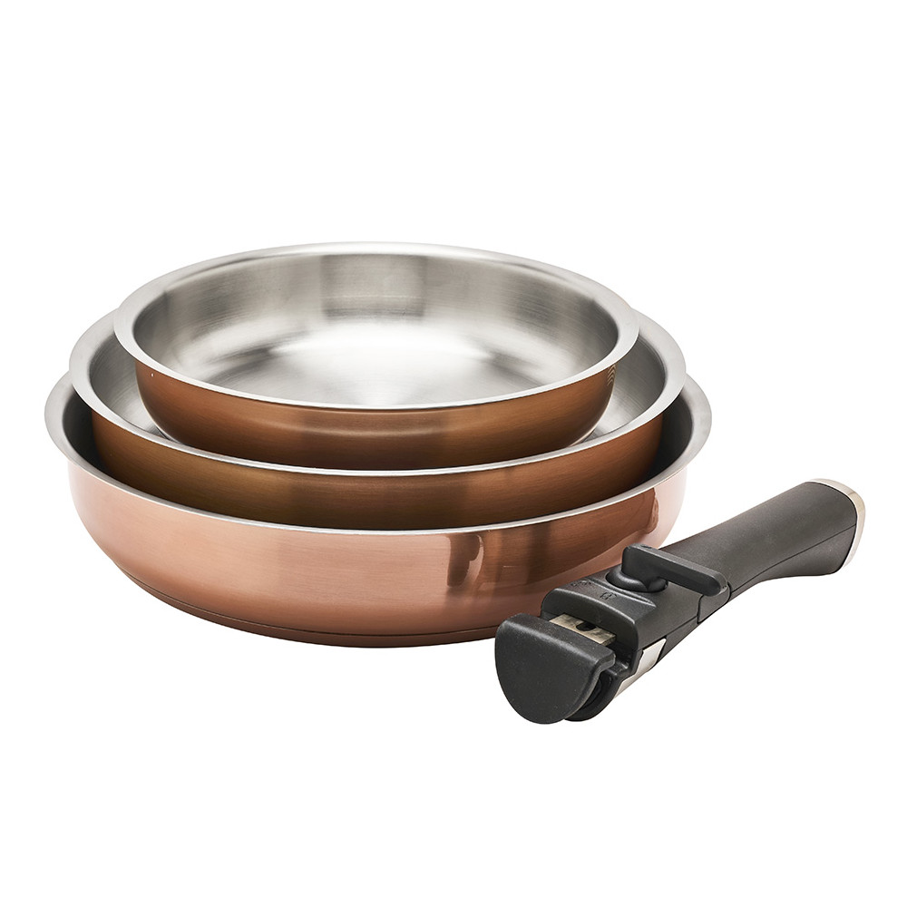 Lot de 3 poêles inox effet cuivré + 1 manche amovible