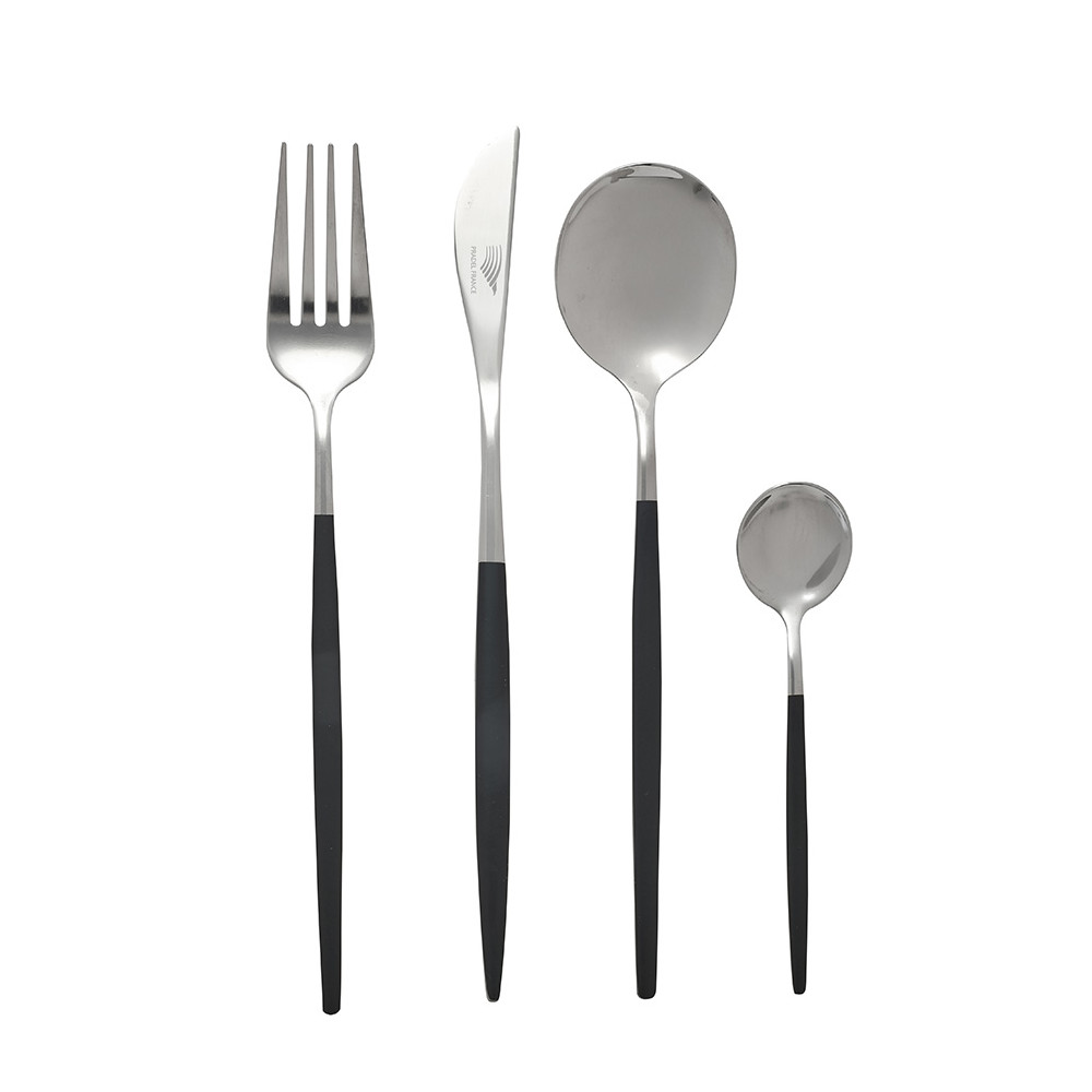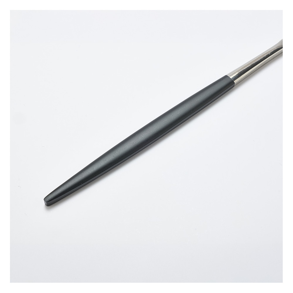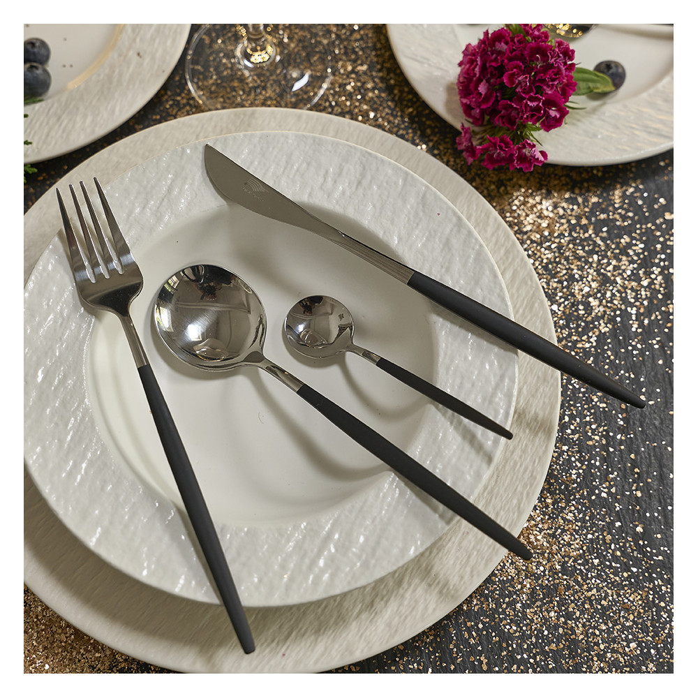La ménagère 24 pièces "NARA" se distingue par son design épuré et sa silhouette fuselée, incarnant l’alliance parfaite entre modernité et raffinement. Conçus en acier inoxydable 18/0, les couverts sont sublimés par un manche noir peint, qui apporte une touche de sobriété chic à l’ensemble.
