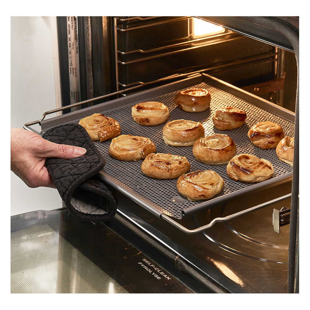 Cette plaque de cuisson est tout d'abord micro-perforée pour assurer une cuisson uniforme, de façon à dorer et à faire croustiller feuilletés, pizzas, choux et autres plats.