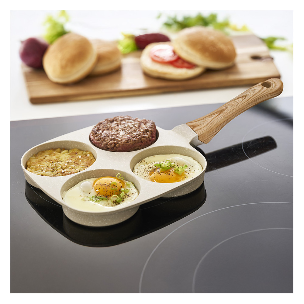 Préparez plusieurs aliments en même temps avec cette poêle 4 compartiments ultra pratique. Plus besoin d’utiliser plusieurs poêles : réalisez en une seule cuisson vos œufs au plat, pancakes, blinis, ou encore vos steaks, chacun dans son espace.