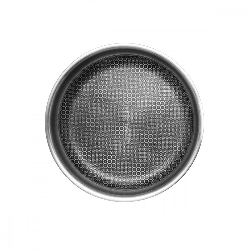 Ce qui distingue cette poêle des poêles habituelles ? C'est la technique de gravure laser qui donne ce design en relief en forme "nid d'abeille". Dans les creux se trouvent l'anti-adhérent et en relief l'acier inoxydable.
